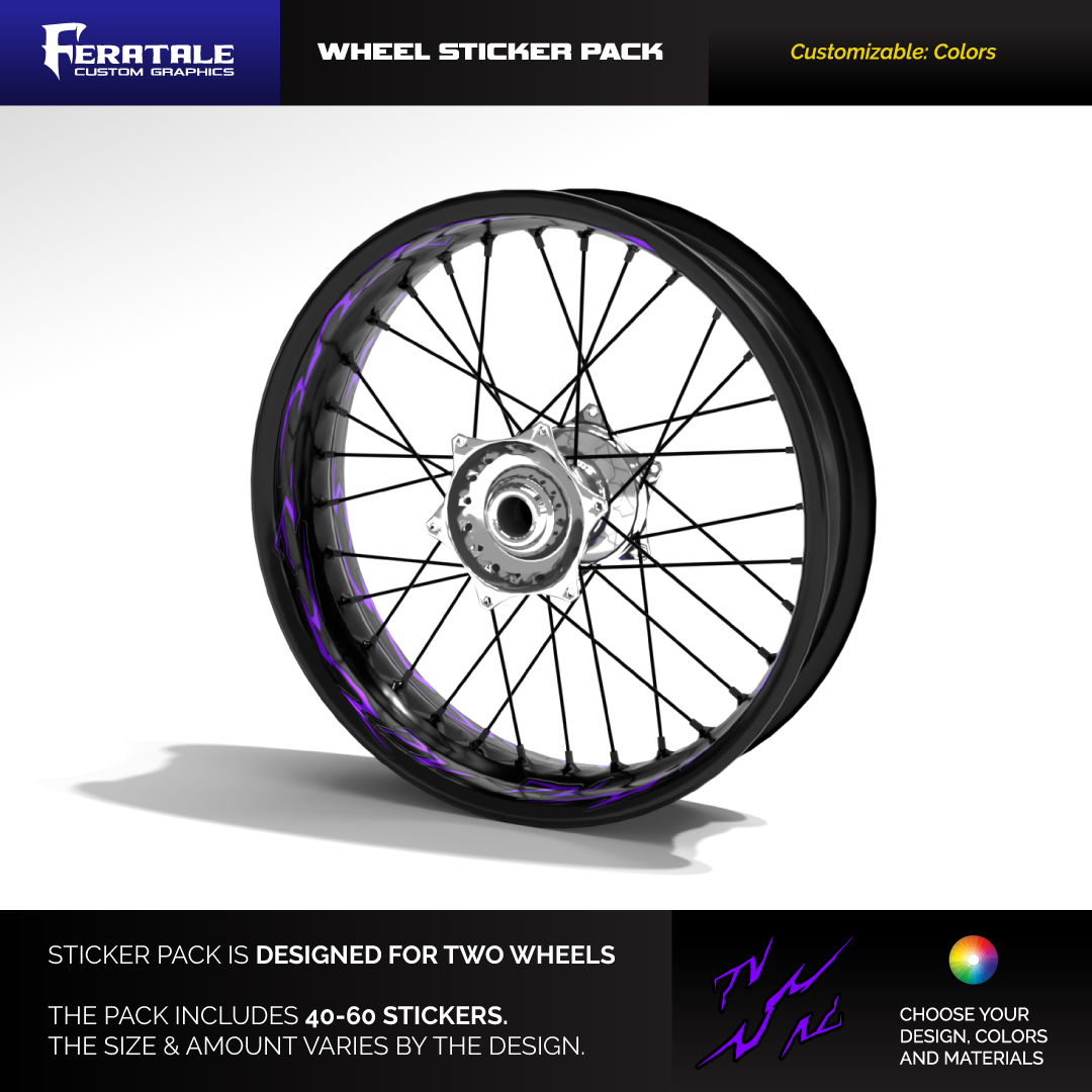 Vannetarrat on suunniteltu kahdelle vanteelle ja sisältää 40–60 erillistä tarraa — määrä ja koko vaihtelevat valitun designin mukaan. Voit valita tarroihin haluamasi värin.